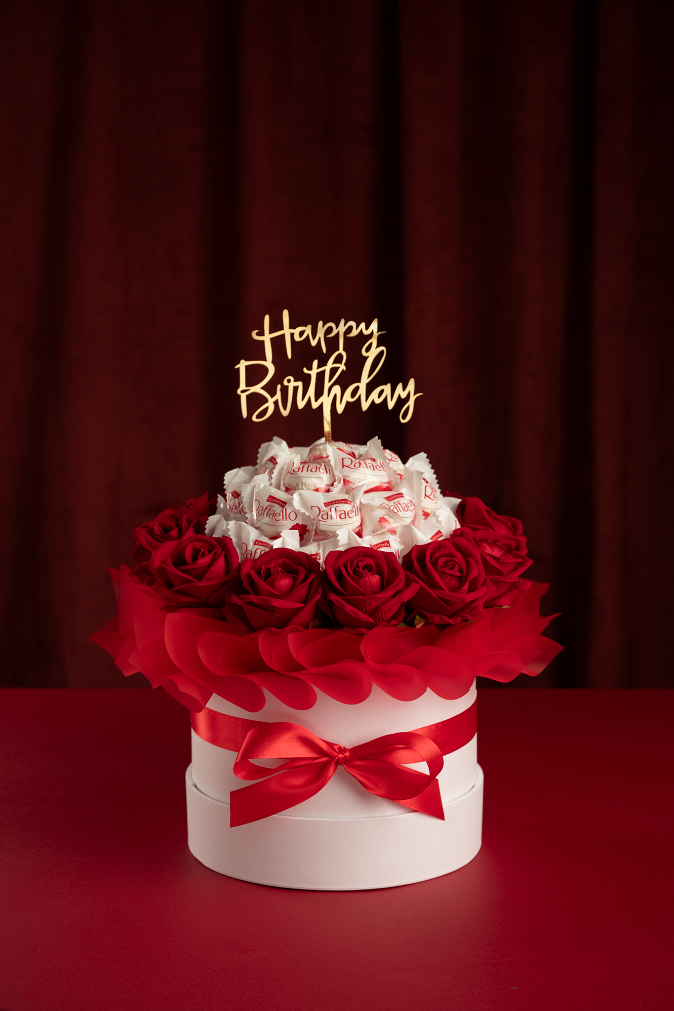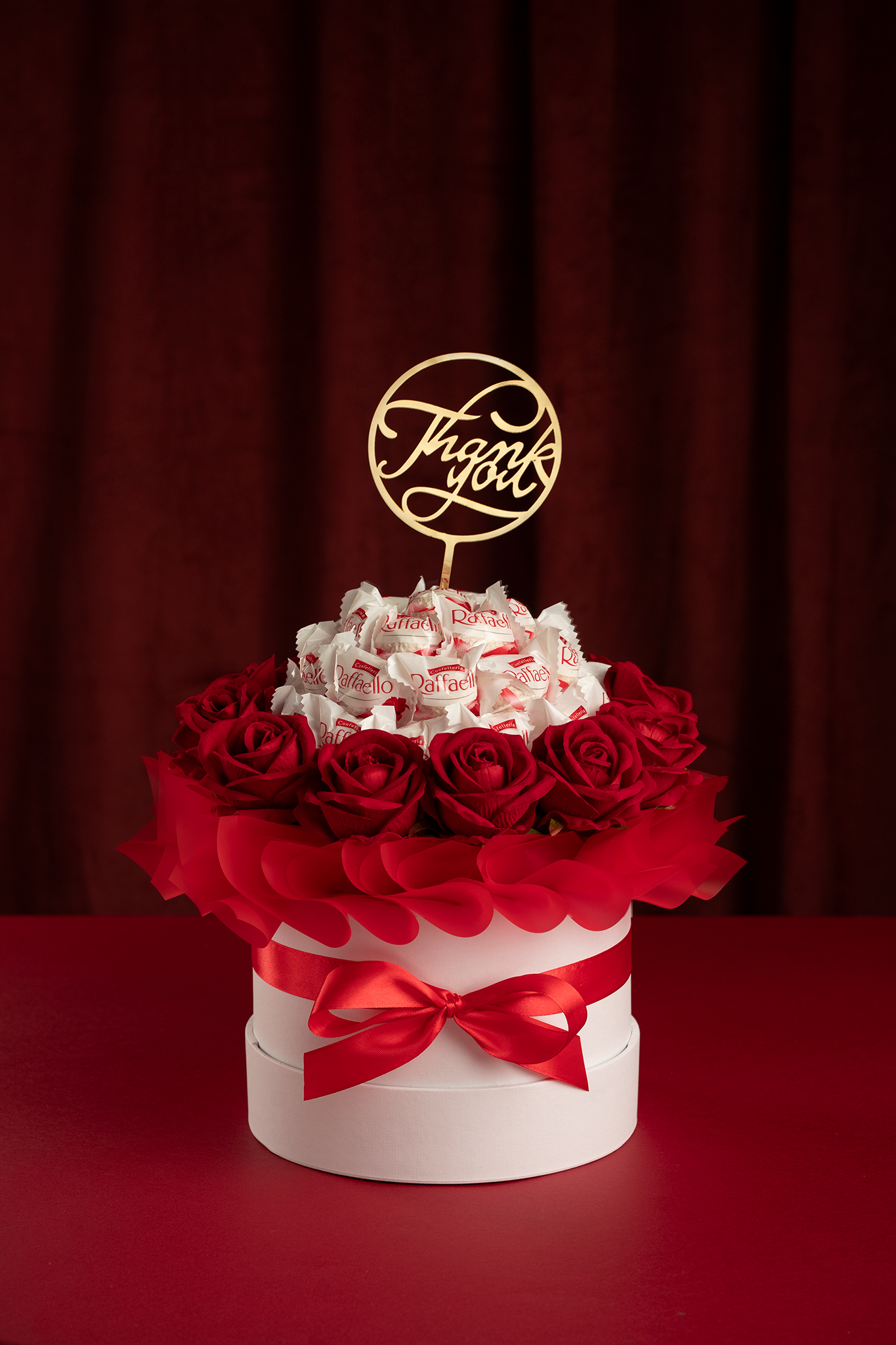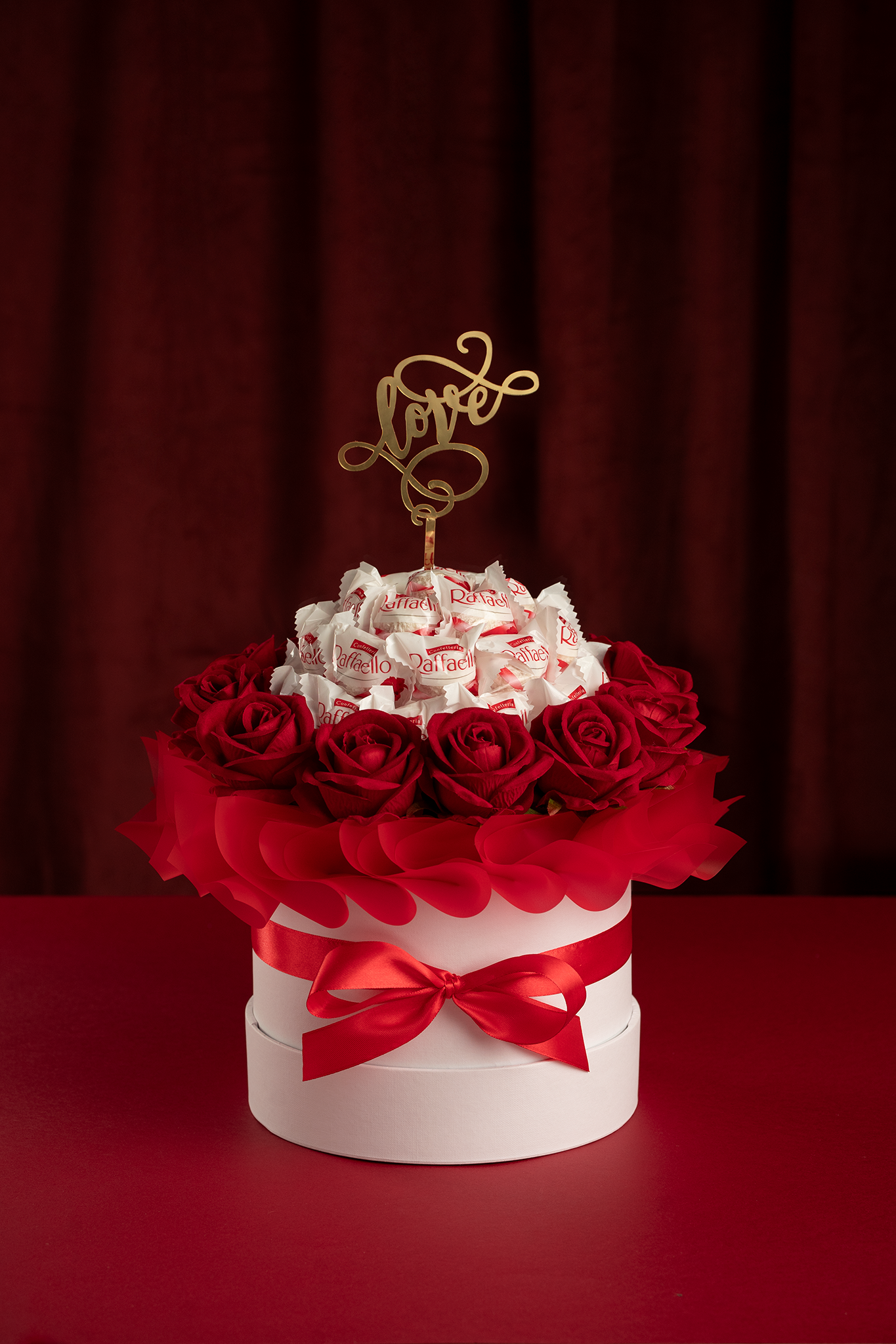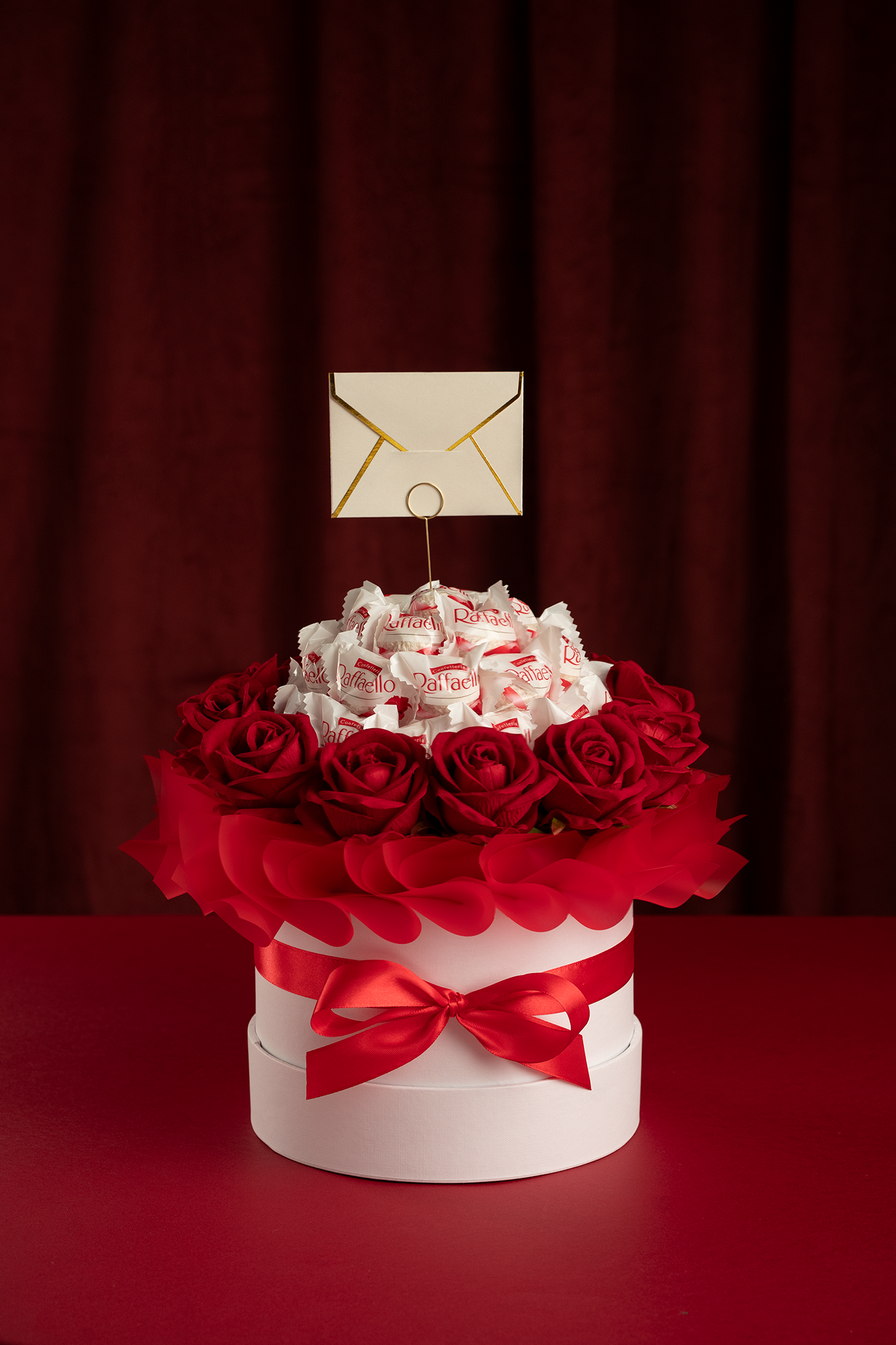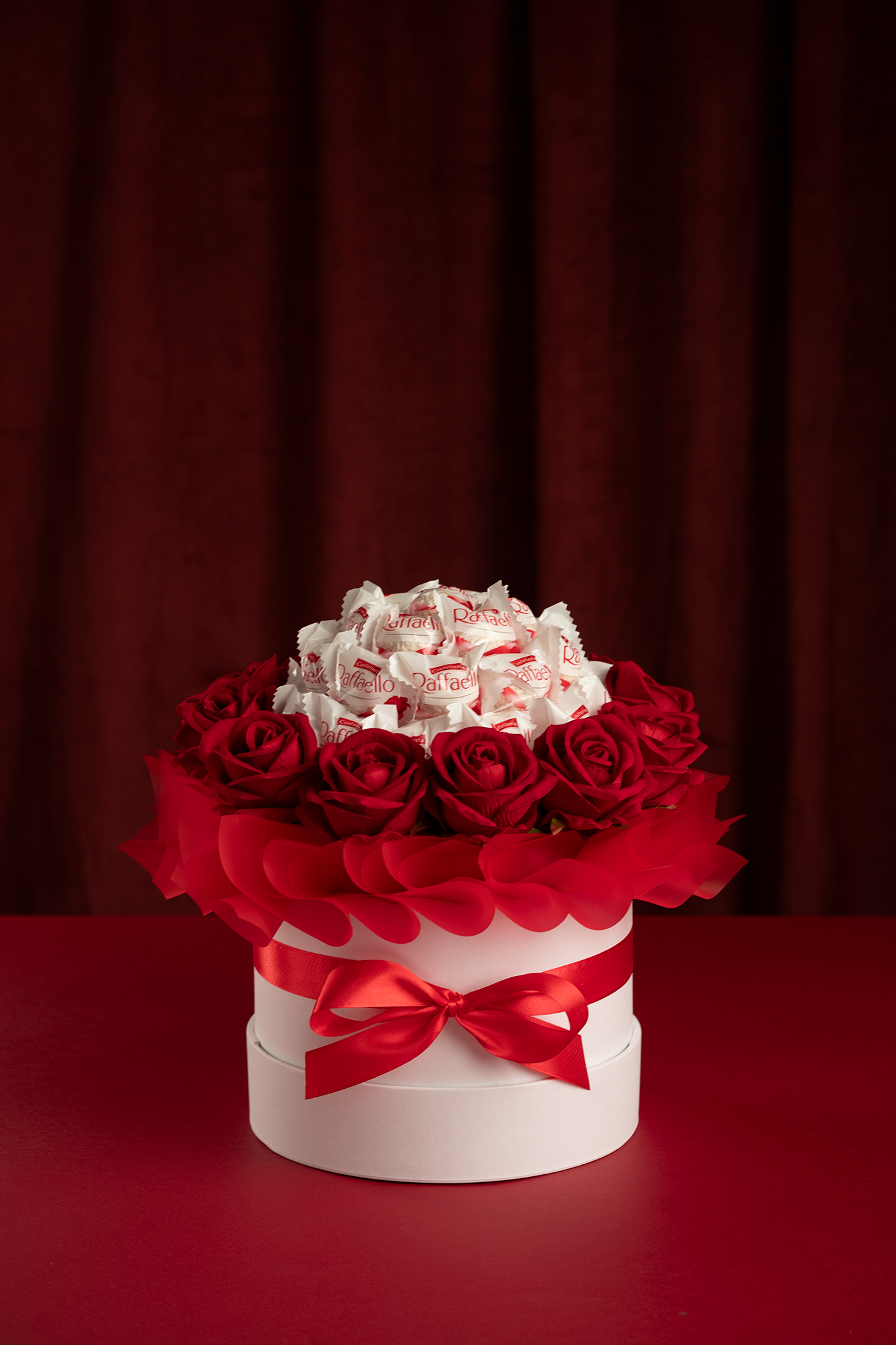 Elegancki i efektowny prezent, który łączy piękno kwiatów z przyjemnością słodkiej chwili. W stylowym białym boxie w rozmiarze M o wymiarach ok. 14 cm wysokości i 20 cm średnicy, znajduje się kompozycja 12 czerwonych róż z welurowymi płatkami oraz ok. 500 g pralinek Ferrero Rocher lub 280 g Rafaello, tworzące luksusową całość. Kwiaty zachwycają głębokim kolorem, realistycznym wyglądem i nie wymagają pielęgnacji, dzięki czemu flowerbox pozostaje piękną pamiątką na długi czas.