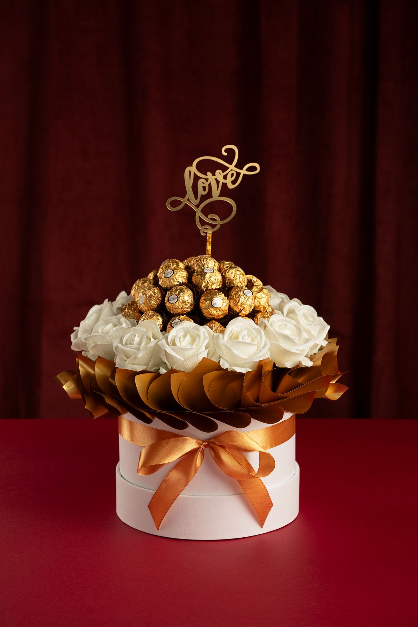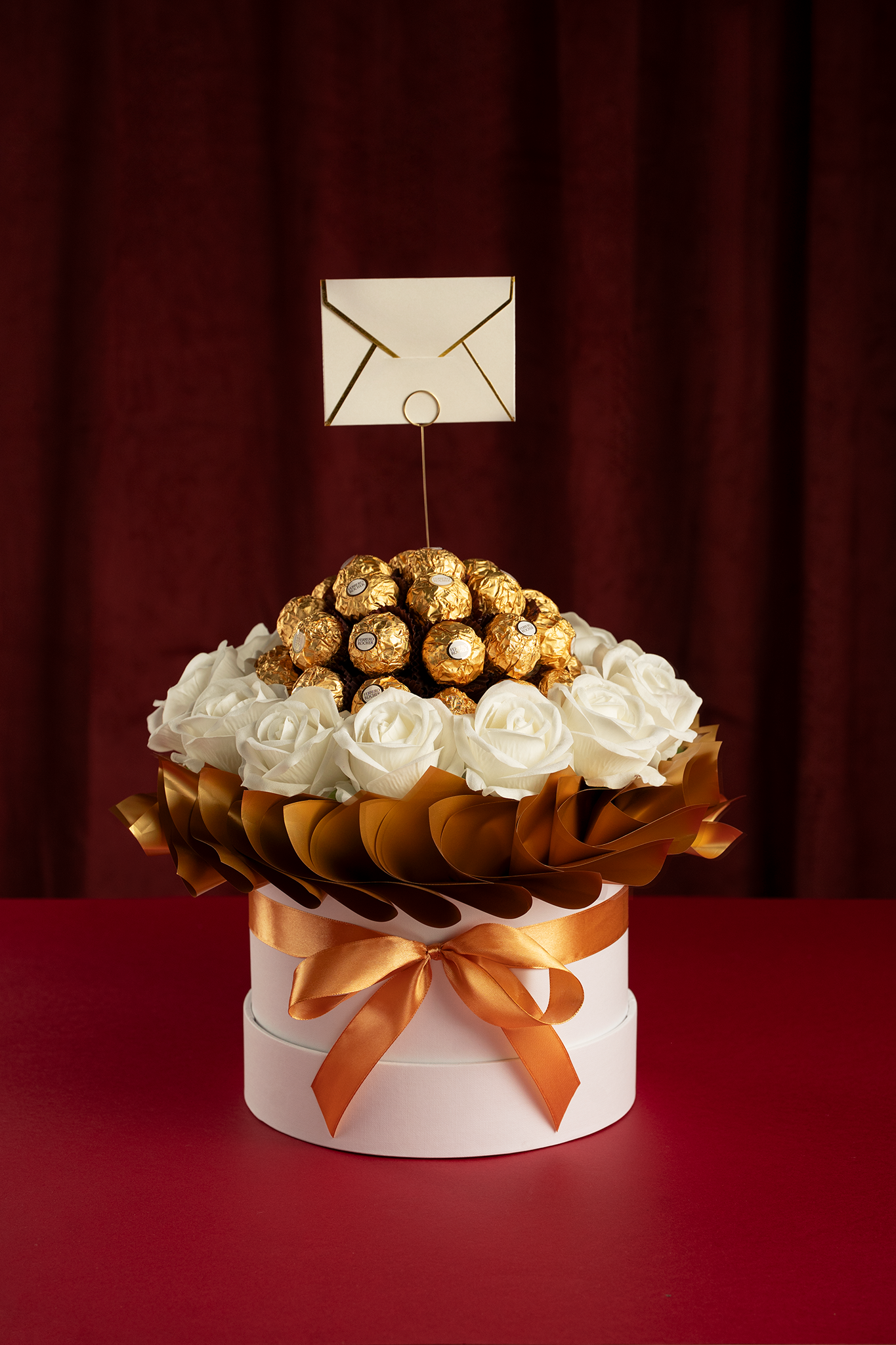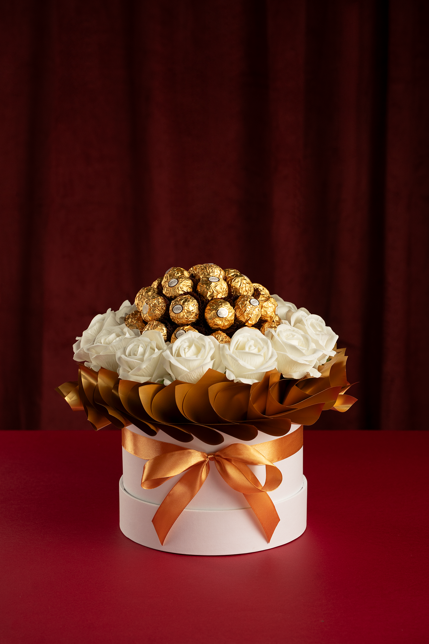 Elegancki i efektowny prezent, który łączy piękno kwiatów z przyjemnością słodkiej chwili. W stylowym białym boxie w rozmiarze M o wymiarach ok. 14 cm wysokości i 20 cm średnicy, znajduje się kompozycja 12 białych sztucznych róż z welurowymi płatkami oraz ok. 500 g pralinek Ferrero Rocher lub 280 g Rafaello, tworzące luksusową całość. Kwiaty zachwycają delikatnością, realistycznym wyglądem i nie wymagają pielęgnacji, dzięki czemu flowerbox pozostaje piękną pamiątką na długi czas.