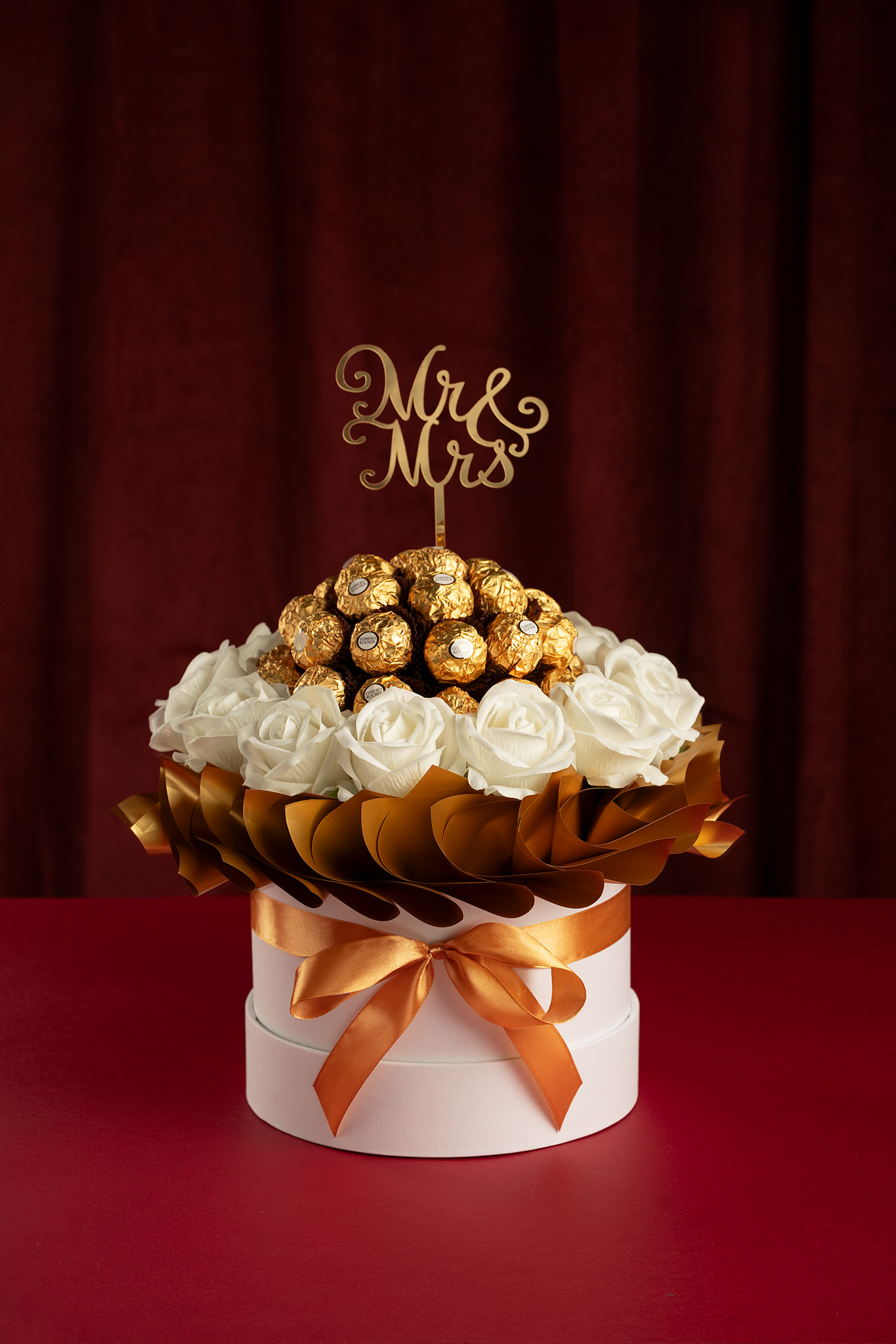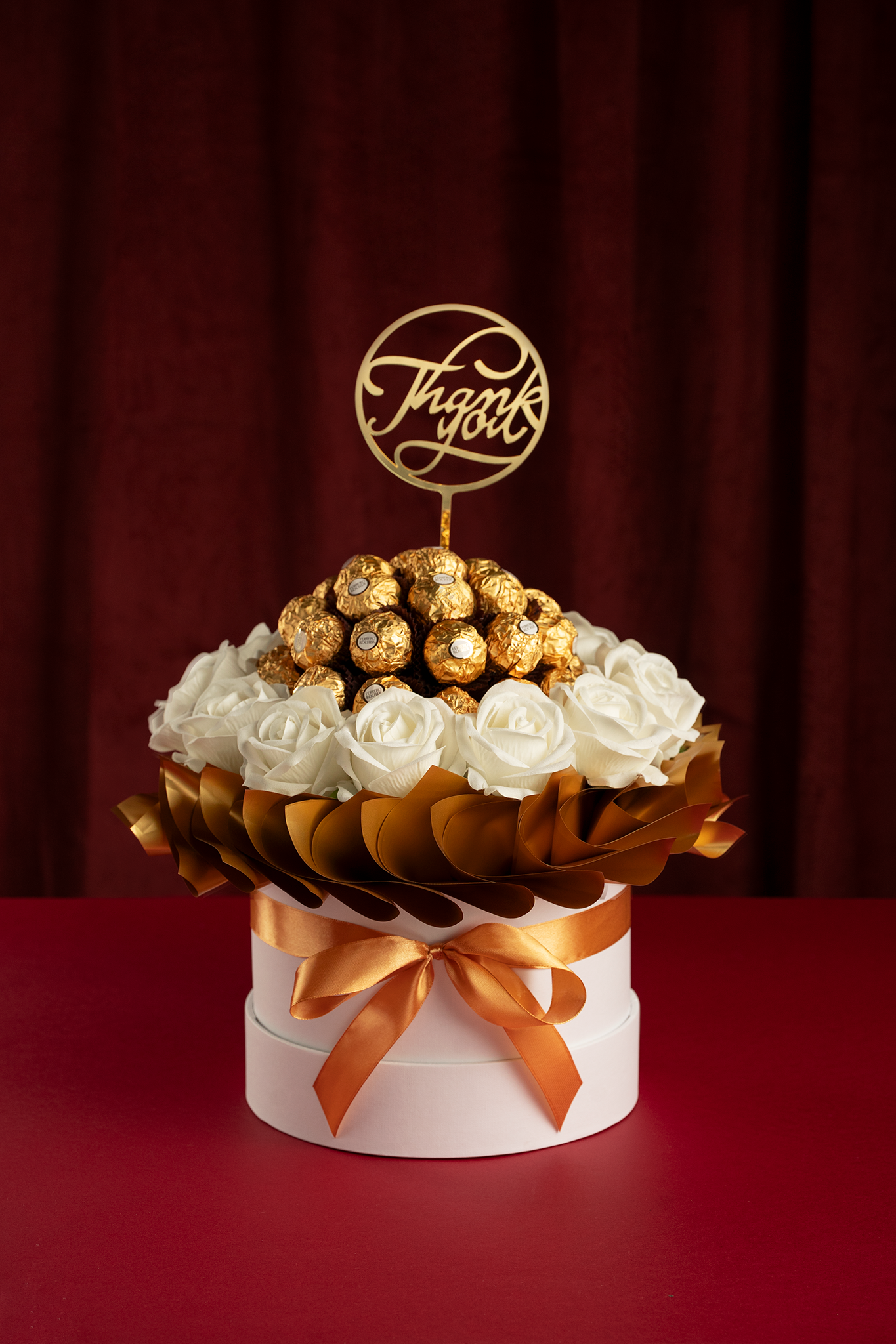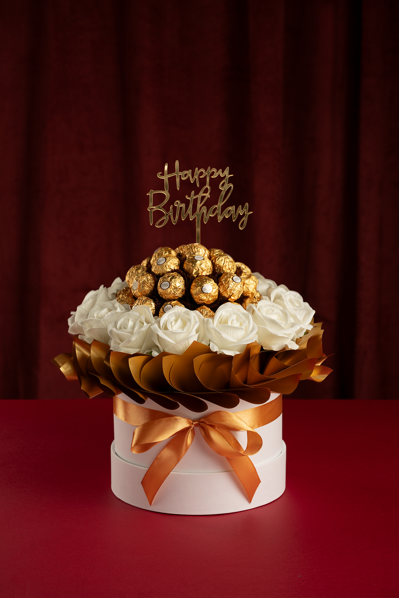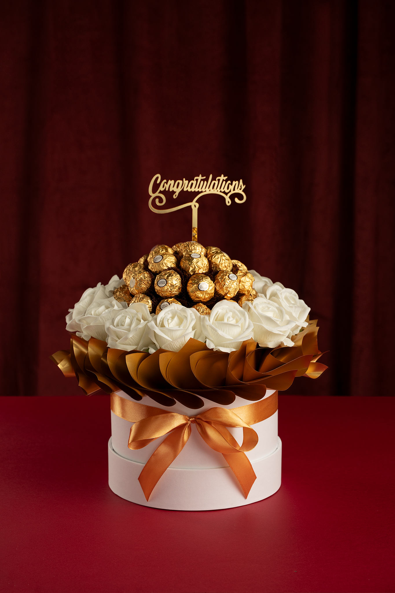 Elegancki i efektowny prezent, który łączy piękno kwiatów z przyjemnością słodkiej chwili. W stylowym białym boxie w rozmiarze M o wymiarach ok. 14 cm wysokości i 20 cm średnicy, znajduje się kompozycja 12 białych sztucznych róż z welurowymi płatkami oraz ok. 500 g pralinek Ferrero Rocher lub 280 g Rafaello, tworzące luksusową całość. Kwiaty zachwycają delikatnością, realistycznym wyglądem i nie wymagają pielęgnacji, dzięki czemu flowerbox pozostaje piękną pamiątką na długi czas.